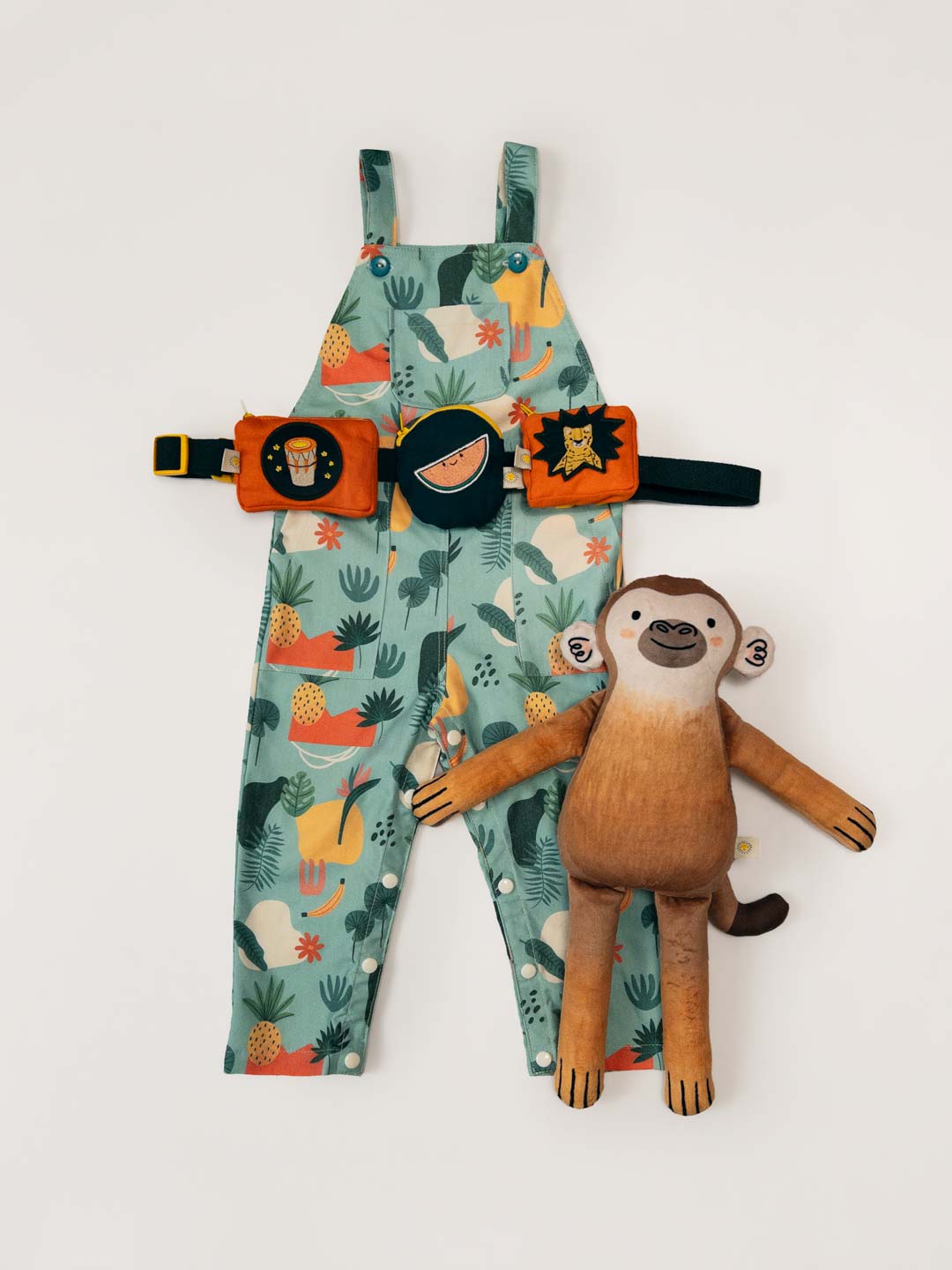 Join our jungle party; we guarantee an incredible time. With this special overall and hat look, accompanied by the squirrel monkey Mani, you'll be ready for the greatest adventures, letting your imagination soar. It comes in a super fun box, which also includes a Mani poster and his story, and a lot of stickers!